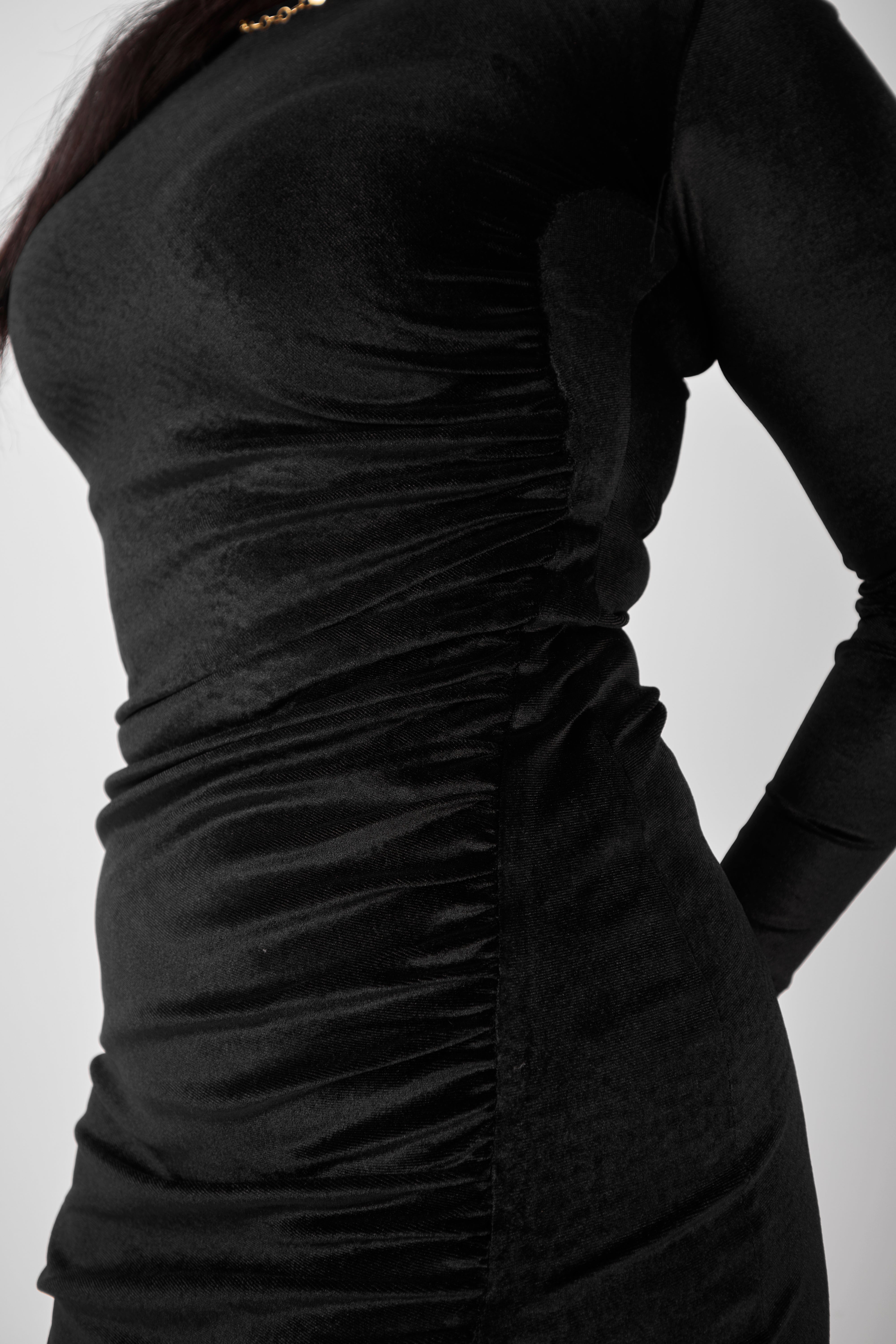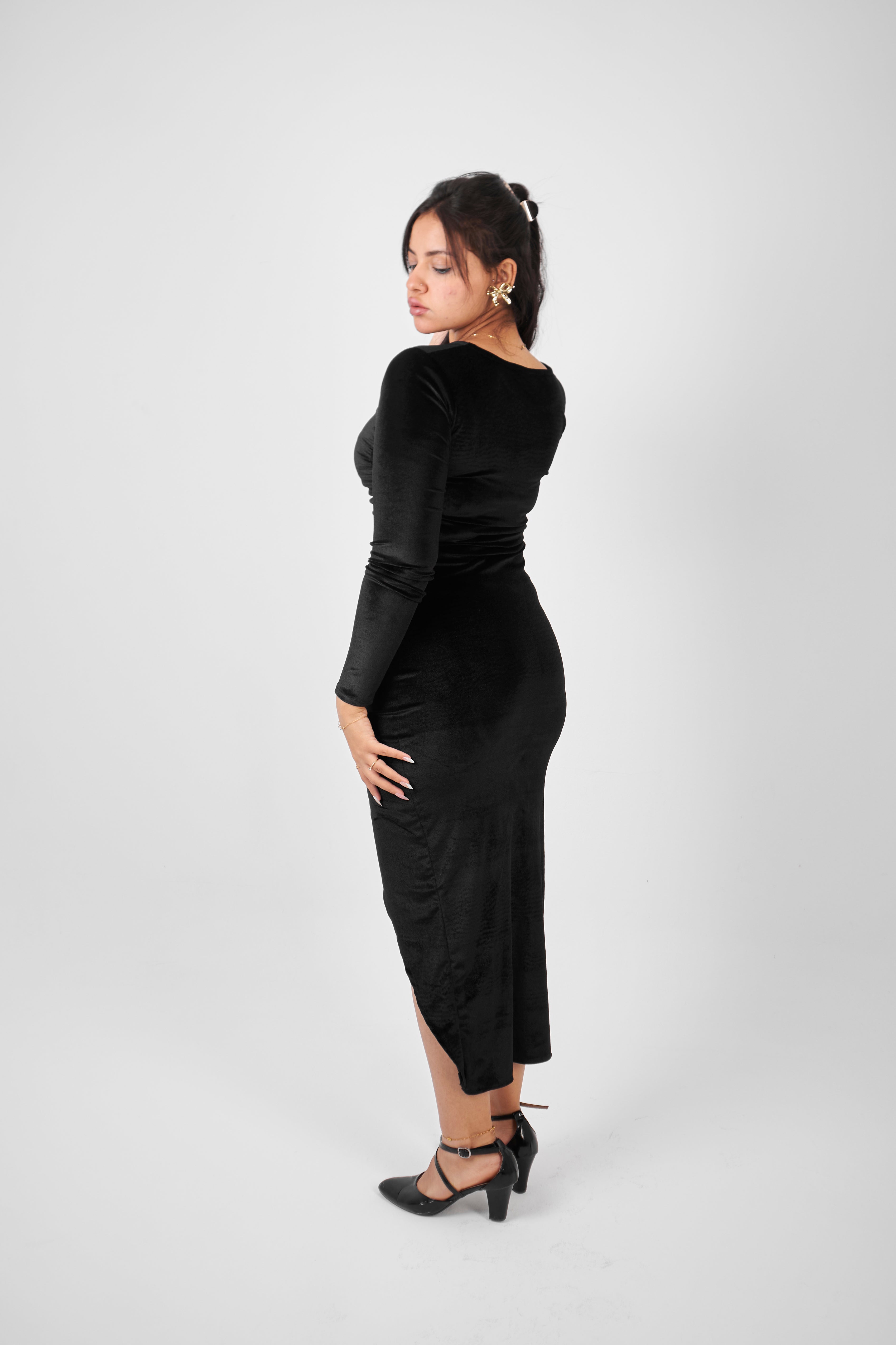 Designed for sophistication, this long-sleeve midi dress is crafted from plush black velvet. It features flattering side ruching that accentuates the waist and a modest faux-wrap hemline with a subtle slit. It's the ideal blend of coverage and curve.