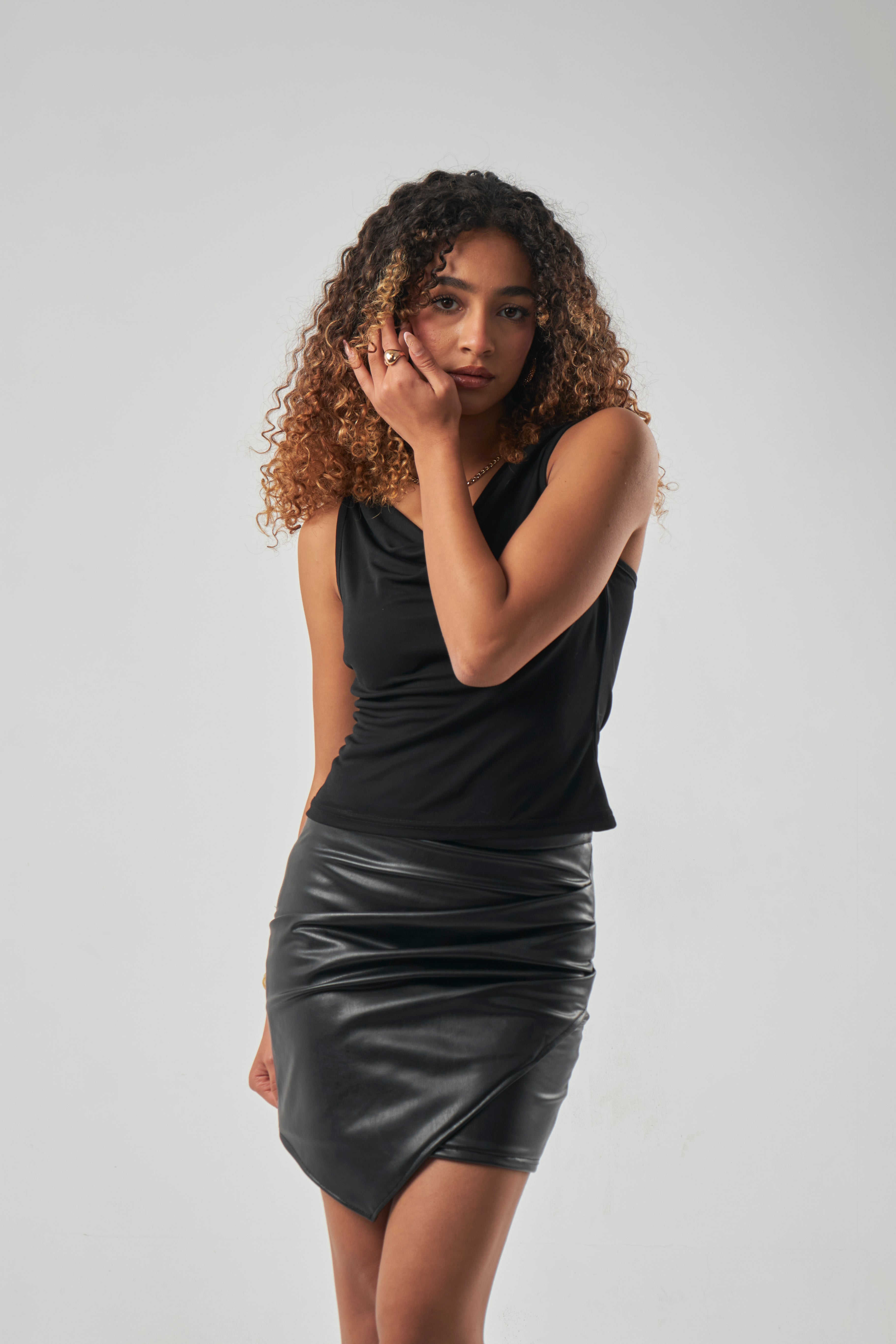 Make a statement in this striking mini skirt. Crafted from smooth faux leather, it features eye-catching side ruching that leads into a modern asymmetric wrap-style hemline. A perfect piece to instantly elevate any top.