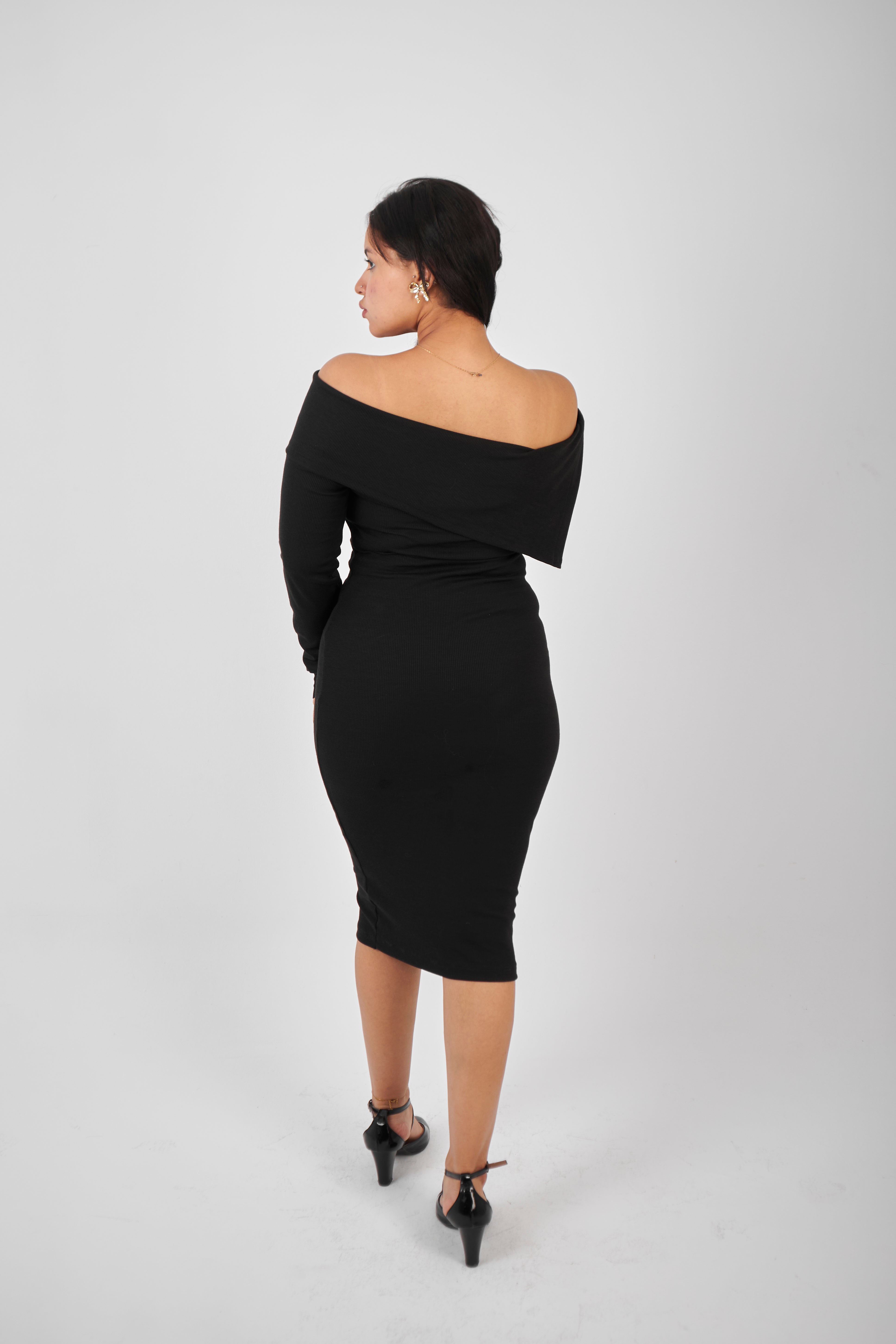 This form-fitting dress features a flattering midi-length silhouette in a comfortable ribbed knit. The standout detail is the dramatic fold-over off-the-shoulder neckline, elegantly held in place by decorative buttons on the shoulder. Perfect for dinner or a chic cocktail event.