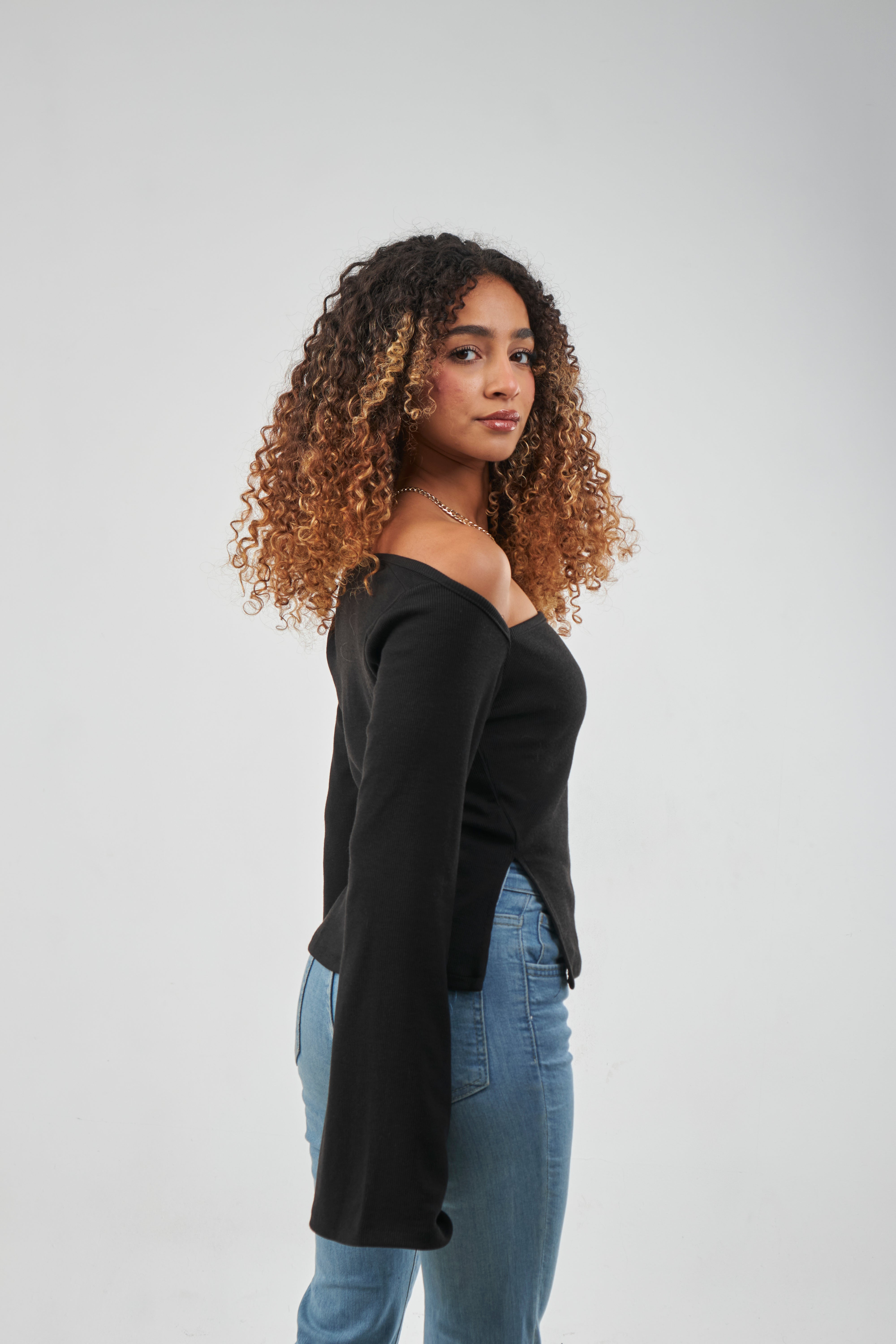 Showcase your shoulders in this figure-flattering top. Made from a comfortable stretch ribbed knit, it features a chic, wide off-the-shoulder neckline and full long sleeves. This versatile piece effortlessly transitions from day to night.