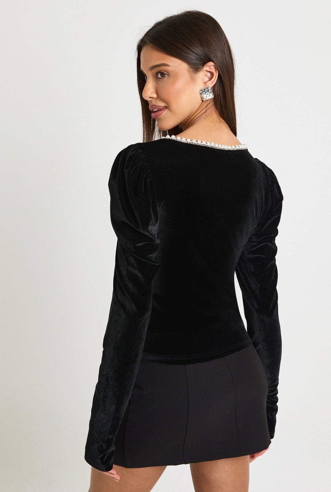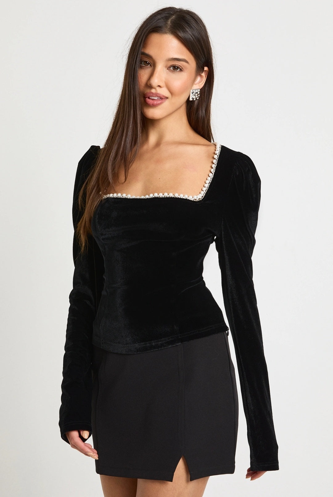 Step into the spotlight with The Lumière Top, a piece defined by its captivating detail and rich texture. This black velvet top features a bold, flattering square neckline exquisitely traced with a delicate pearl-beaded trim, adding an instant touch of regal charm. Structured puff shoulders lead into fitted long sleeves, completing the romantic silhouette. Crafted from luxurious stretch velvet for a sculpted fit, The Lumière Top is an ideal choice for holiday parties, special occasions, or elevating any evening ensemble.