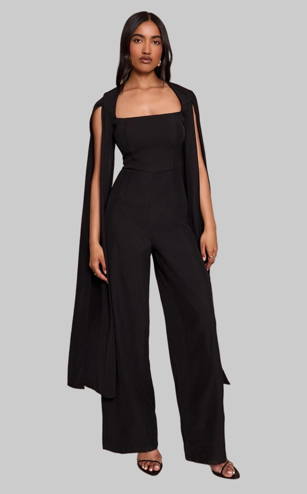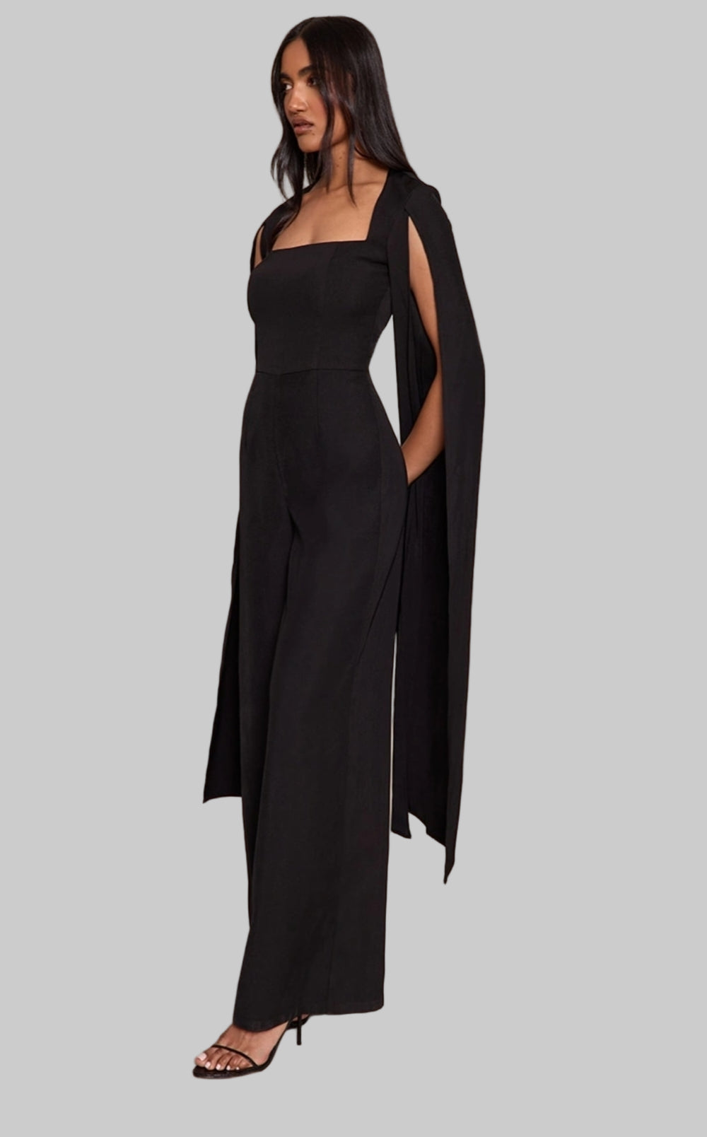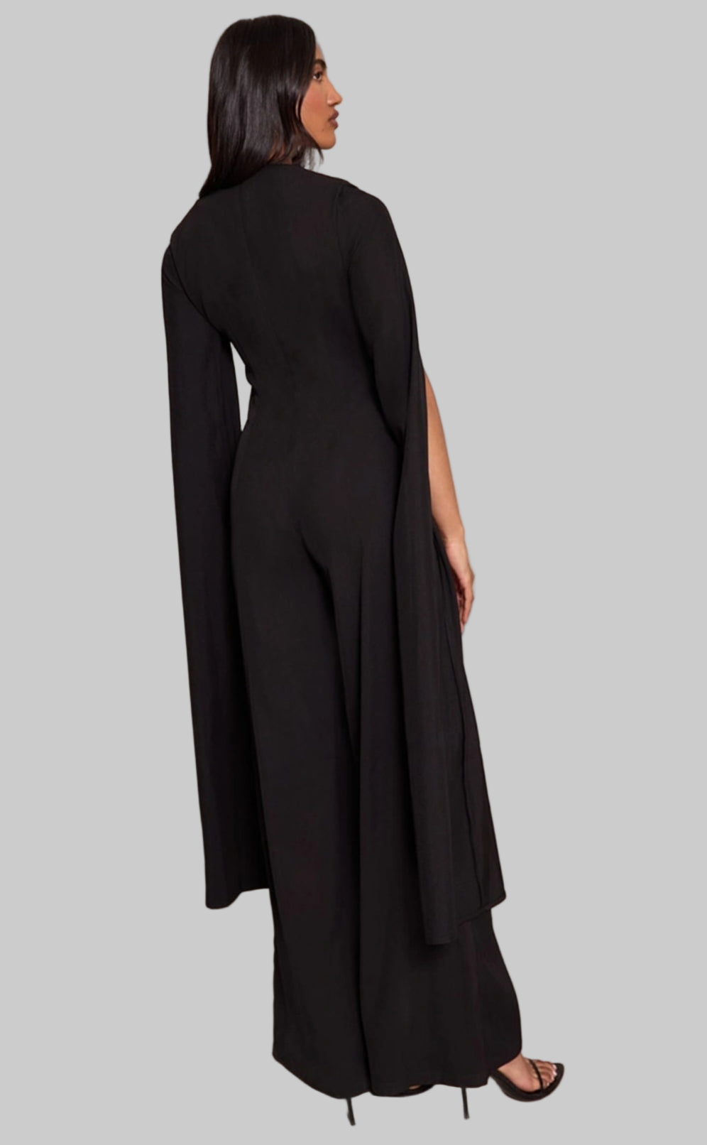 Crafted from luxurious matte black fabric, The Capella features a contemporary square neckline and a tailored wide-leg trouser that offers a flattering, elongated silhouette. The show-stopping element is the dramatic, free-flowing cape sleeves, which drape effortlessly from the shoulders, creating the movement and majesty of a gown while maintaining the comfort and modern edge of a jumpsuit.